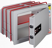 Надёжность сейфа обеспечивает массивная дверная панель из двух слоёв стали высокого качества, толщиной 10 мм, между которыми размещается защищённый от взлома и других видов силового воздействия замковый механизм, а также специальная ригельная система, гарантирующая крепкое запирание.